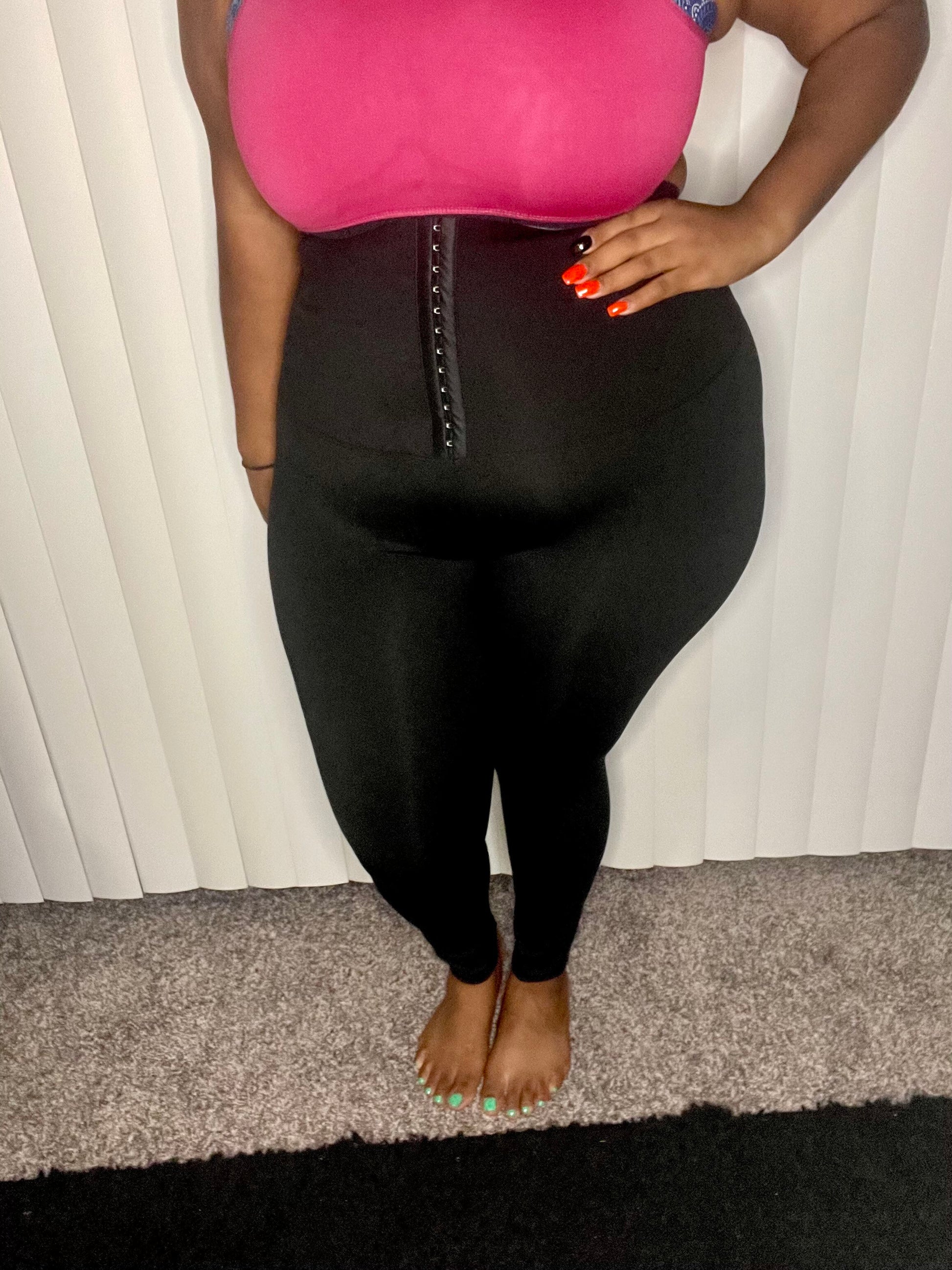 Our Waist Trainer- Yoga pants is equipped with a Hook and Eye Closure design which allows for an adjustable closure around your mid section so you can choose from light to moderate compression!